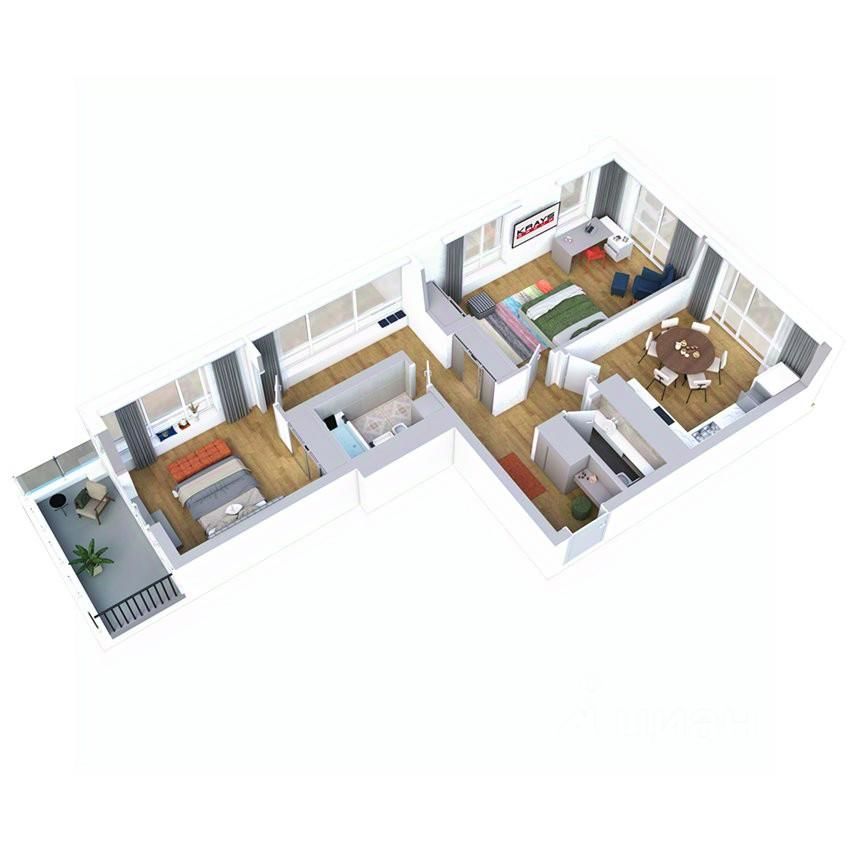 Светлая и просторная квартира с панорамными окнами на три стороны и террасой. Остекление выполнено в том числе в зоне прихожей и коридора, что создаёт дополнительное естественное освещение. Все помещения наполнены светом и просторны, при этом имеют рациональную площадь и форму, благодаря проработанному дизайн-проекту.