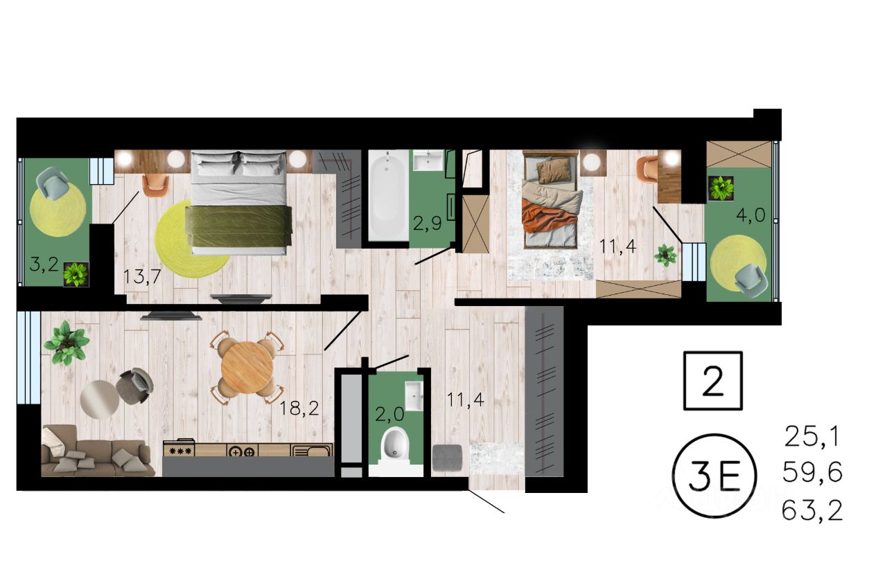 3 к евро, Две спальни, Кухня-гостиная, Две лоджии