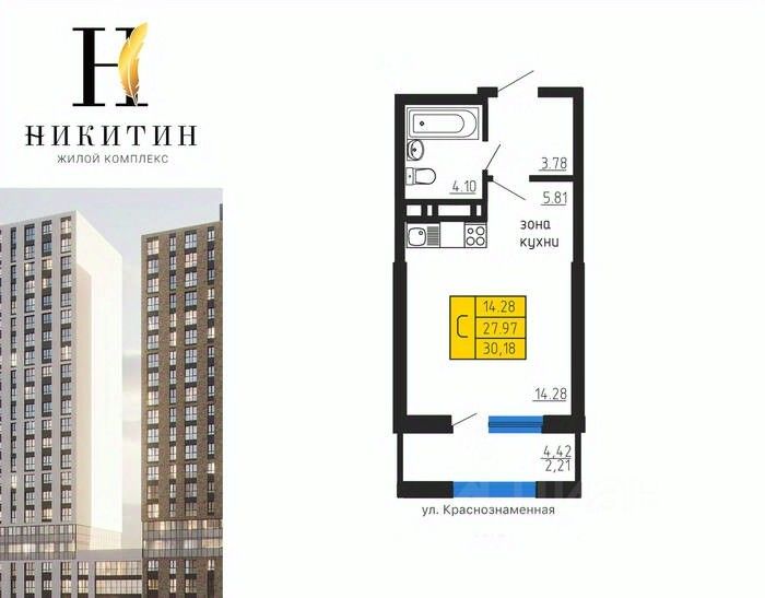 Продаётся студия в строящемся доме (Дом 2), срок сдачи: IV-кв. 2027, общей площадью 30.18 кв.м., на 6 этаже. Жилой комплекс "Никитин" расположен в Ленинском районе города Воронеж. Он представляет собой современный жилой комплекс, который включает в себя несколько многоэтажных домов, обустроенных территорию и парковочные места.