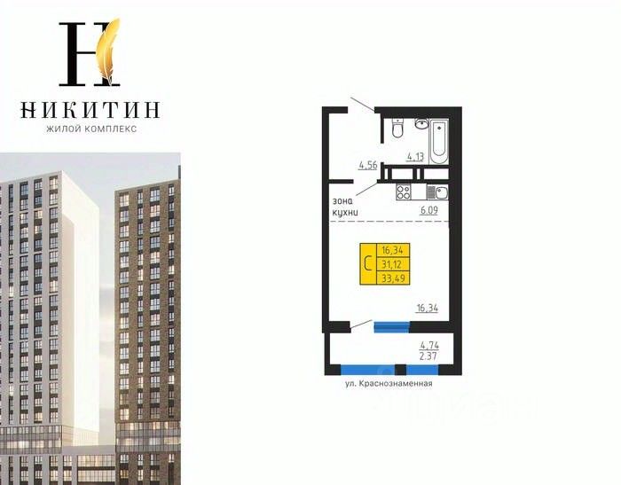 Продаётся студия в строящемся доме (Дом 2), срок сдачи: IV-кв. 2027, общей площадью 33.49 кв.м., на 14 этаже. Жилой комплекс "Никитин" расположен в Ленинском районе города Воронеж. Он представляет собой современный жилой комплекс, который включает в себя несколько многоэтажных домов, обустроенных территорию и парковочные места.