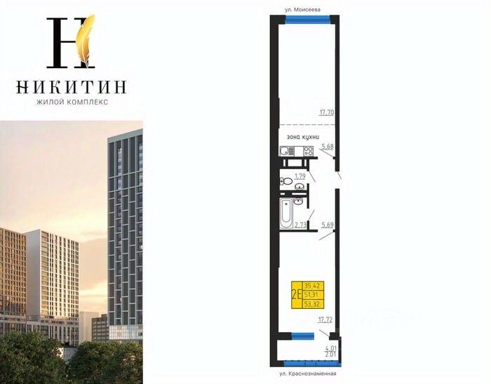 Продаётся 2-комнатная квартира в строящемся доме (Дом 2), срок сдачи: IV-кв. 2027, общей площадью 53 кв.м., на 19 этаже. Жилой комплекс "Никитин" расположен в Ленинском районе города Воронеж. Он представляет собой современный жилой комплекс, который включает в себя несколько многоэтажных домов, обустроенных территорию и парковочные места.