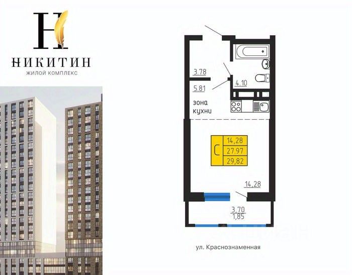 Продаётся студия в строящемся доме (Дом 2), срок сдачи: IV-кв. 2027, общей площадью 29.82 кв.м., на 16 этаже. Жилой комплекс "Никитин" расположен в Ленинском районе города Воронеж. Он представляет собой современный жилой комплекс, который включает в себя несколько многоэтажных домов, обустроенных территорию и парковочные места.