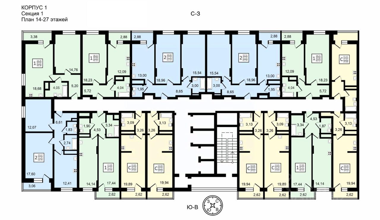 Планировки представлены студиями, 1К и 2К вариантами. Студии до 27 кв.м, 1-комнатные квартиры 41-42 кв.м, 2-комнатные квартиры 54-62 кв.м.