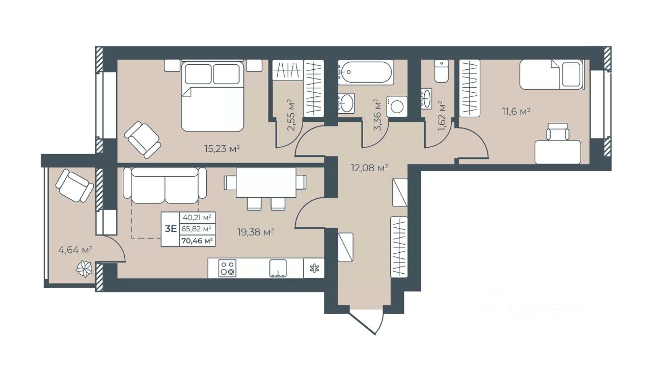 Продаётся 3-комнатная квартира в строящемся доме (Дом 3), срок сдачи: I-кв. 2027, общей площадью 70.46 кв.м., на 5 этаже. Новый жилой комплекс комфорт-класса "Ботаника Парк" от застройщика "БМ-Групп" в городе Павловск.