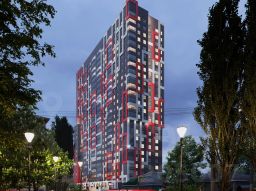 Дом красивый и заметный внешне. Архитектурная выразительность здания достигается ритмичным рисунком контрастных декоративных элементов с гармоничным сочетанием коричневого, красного и бежевого цветов.