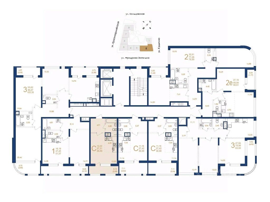 - Площадь квартир: от 29,89 до 127,29 кв. м