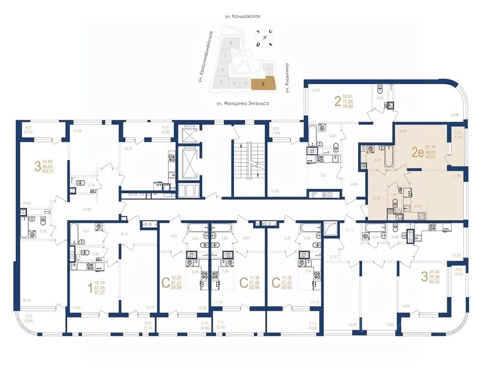 - Площадь квартир: от 29,89 до 127,29 кв. м