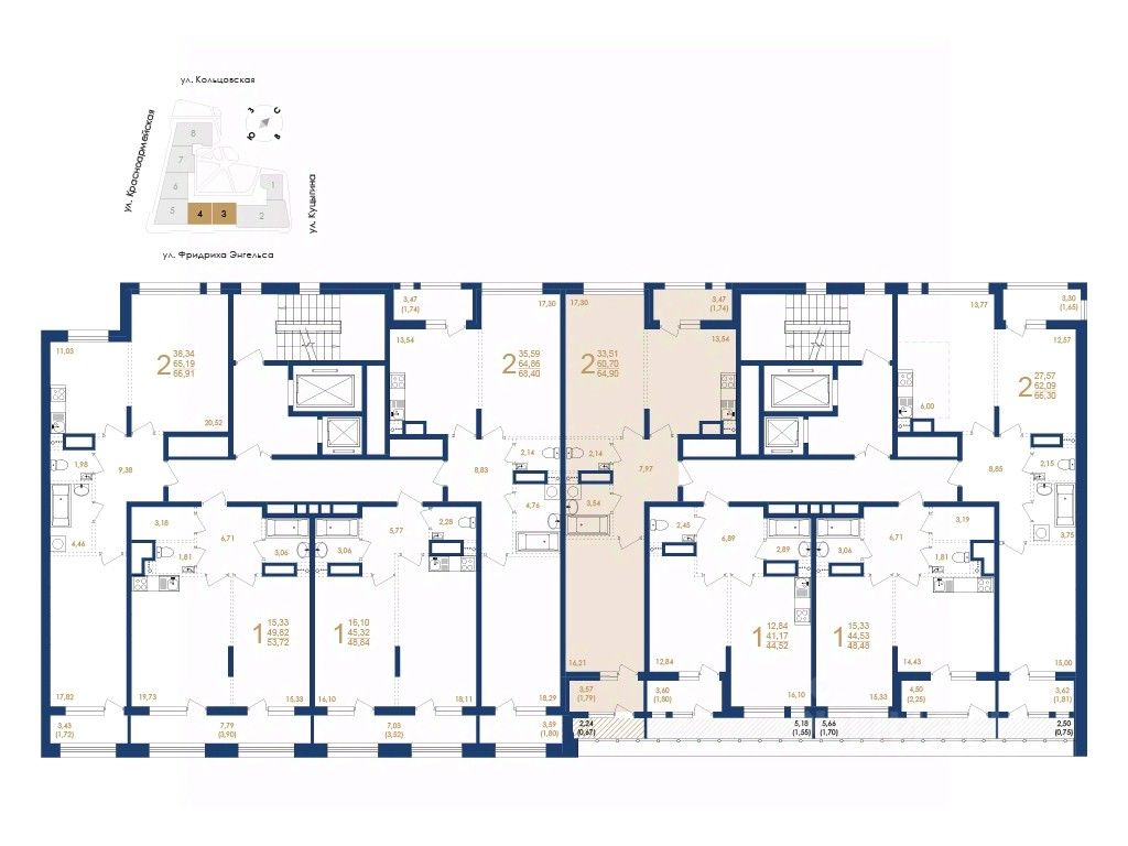 - Площадь квартир: от 29,89 до 127,29 кв. м