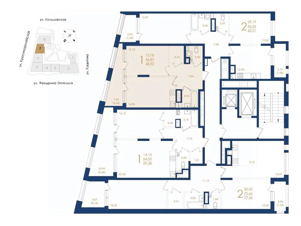 - Площадь квартир: от 29,89 до 127,29 кв. м