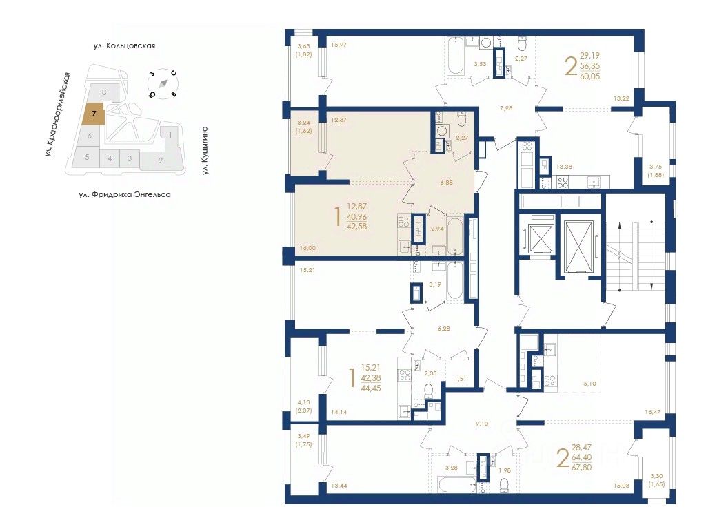- Площадь квартир: от 29,89 до 127,29 кв. м