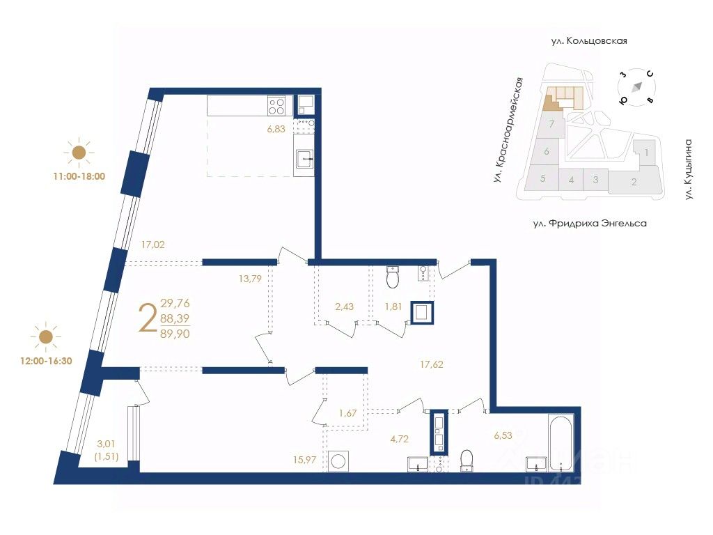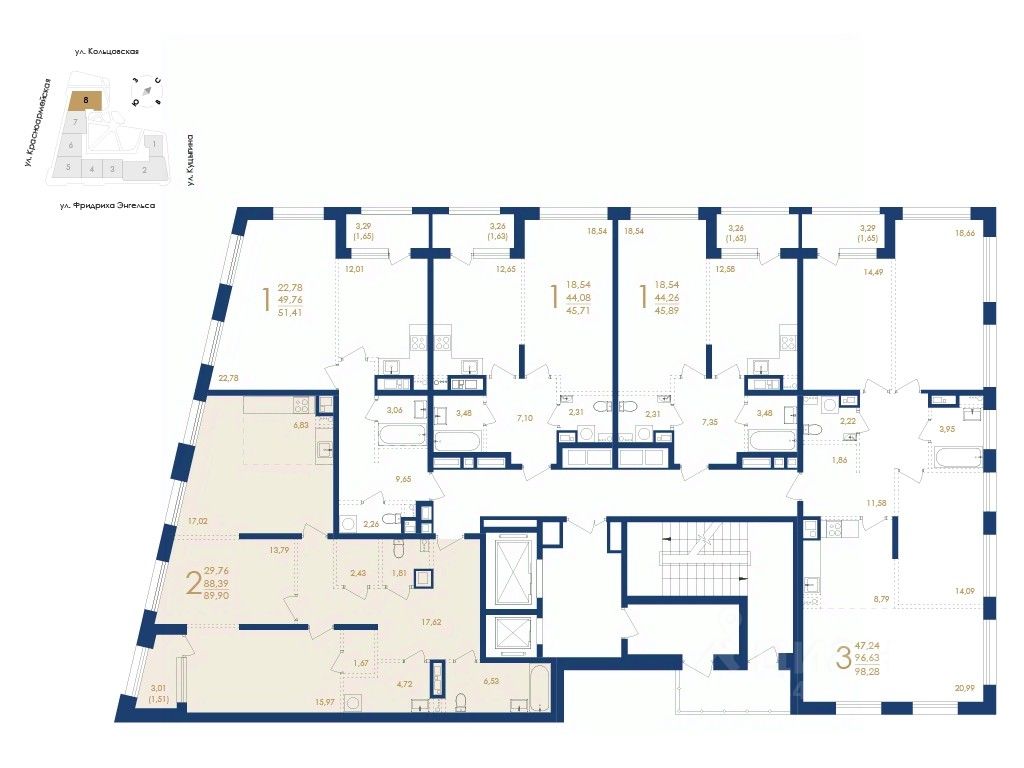 - Площадь квартир: от 29,89 до 127,29 кв. м