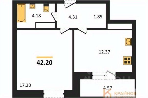 Квартира: 1 к 42,20 кв.м., 21 этаж в комплексе Галилей, 1 очередь, корп.3, сдача: 3кв. , этажей: 25, адрес Воронеж г., Кривошеина ул., д. 13/14, Застройщик: ГК Крайс.