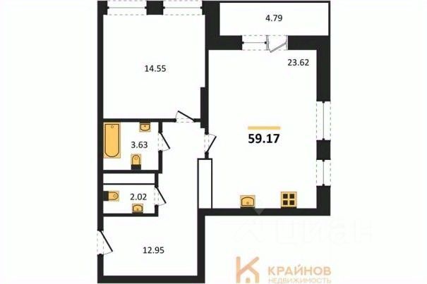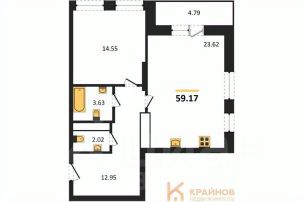 Квартира: 1 к 59,17 кв.м., 5 этаж в комплексе Галилей, 1 очередь, корп.3, сдача: 3кв. , этажей: 25, адрес Воронеж г., Кривошеина ул., д. 13/14, Застройщик: ГК Крайс.