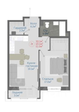 Большая кухня-гостиная, Прихожая с гардеробной комнатой, Выход на балкон из кухни, Удобная средних размеров спальня с просторной нишей, Изолированная от гостевой жилая зона