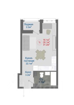 Квартира, где есть всё что нужно: небольшая прихожая, санузел удобной прямоугольной формы, широкая жилая комната-кухня с компактной лоджией. Увеличенные видовые окна, ПСК 4.6%19.9%.