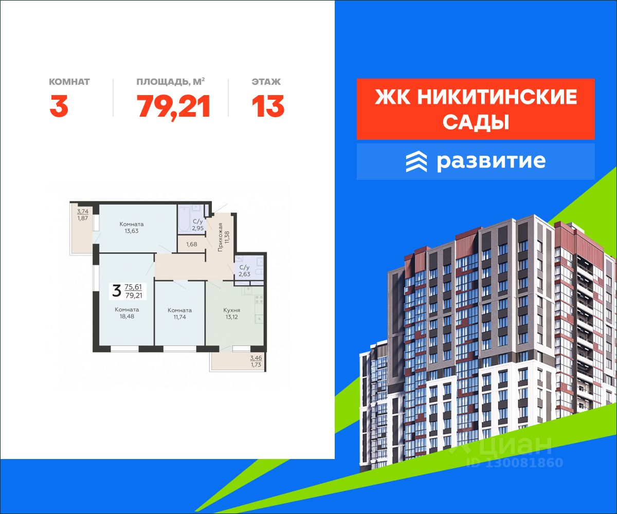 В продаже квартира площадью 79.21 кв. м с черновой отделкой. Квартира расположена на 13 этаже 20 этажного дома, в жилом комплексе комфорт-класса "Никитинские сады".