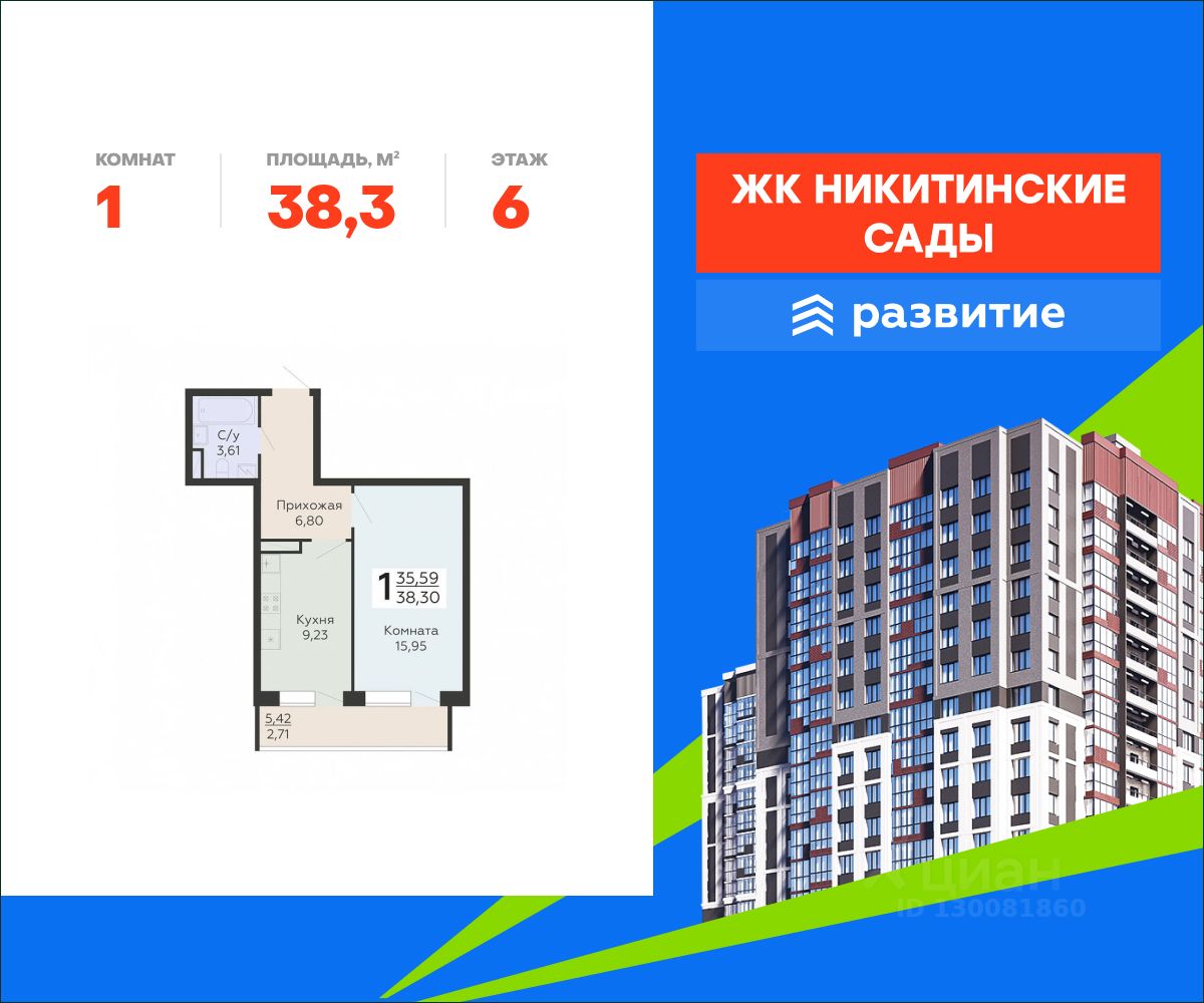 В продаже квартира площадью 38.30 кв. м с черновой отделкой. Квартира расположена на 6 этаже 20 этажного дома, в жилом комплексе комфорт-класса "Никитинские сады".