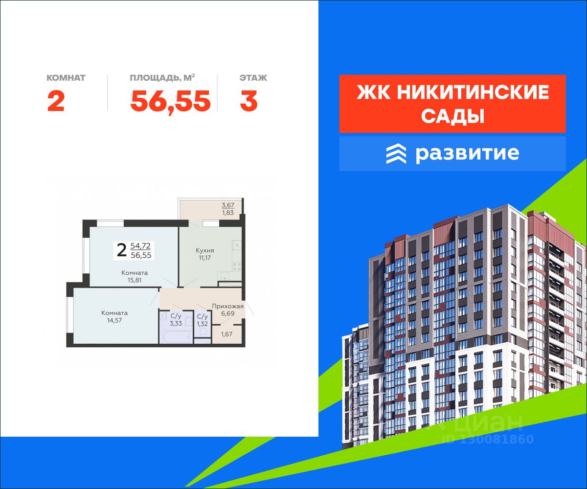 В продаже квартира площадью 56.55 кв. м с черновой отделкой. Квартира расположена на 3 этаже 20 этажного дома, в жилом комплексе комфорт-класса "Никитинские сады".