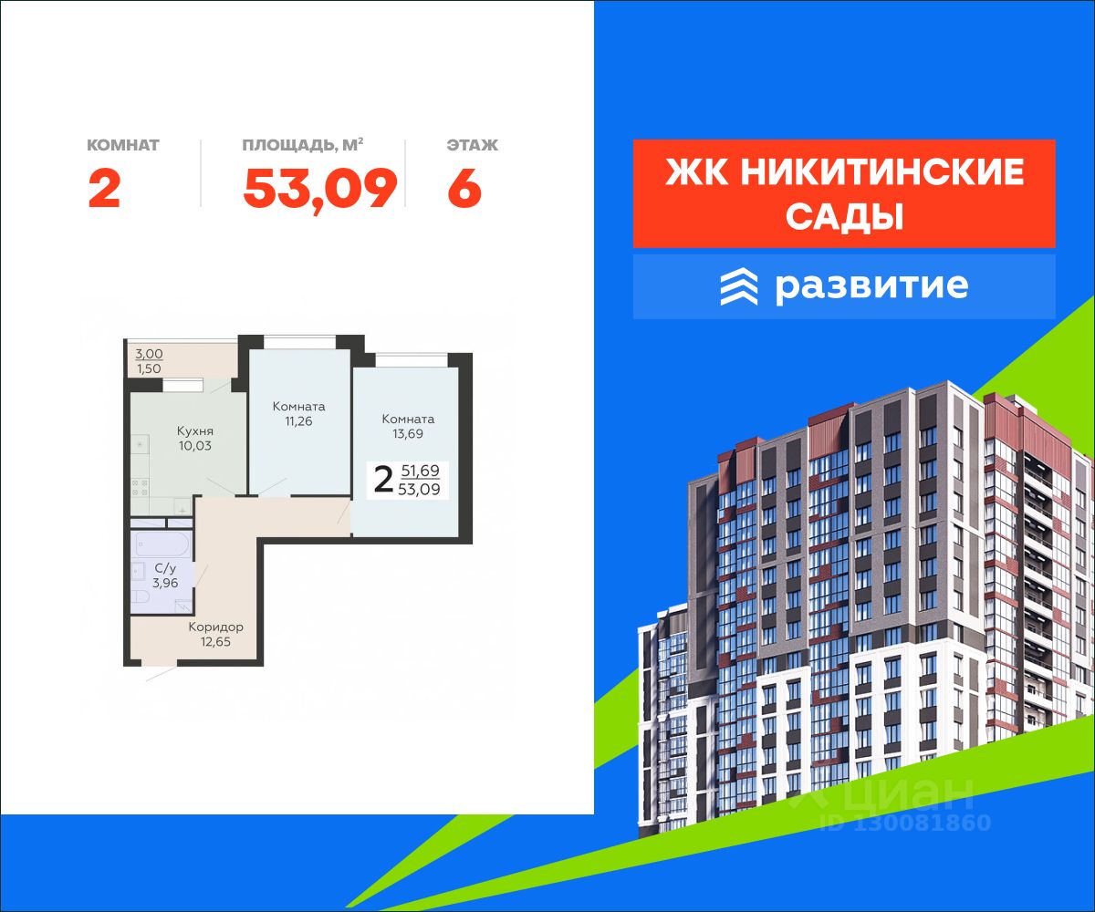 В продаже квартира площадью 53.09 кв. м с черновой отделкой. Квартира расположена на 6 этаже 20 этажного дома, в жилом комплексе комфорт-класса "Никитинские сады".