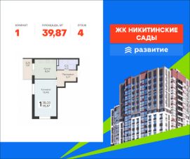 В продаже квартира площадью 39.87 кв. м с отделкой. Квартира расположена на 4 этаже 20 этажного дома, в жилом комплексе комфорт-класса "Никитинские сады".