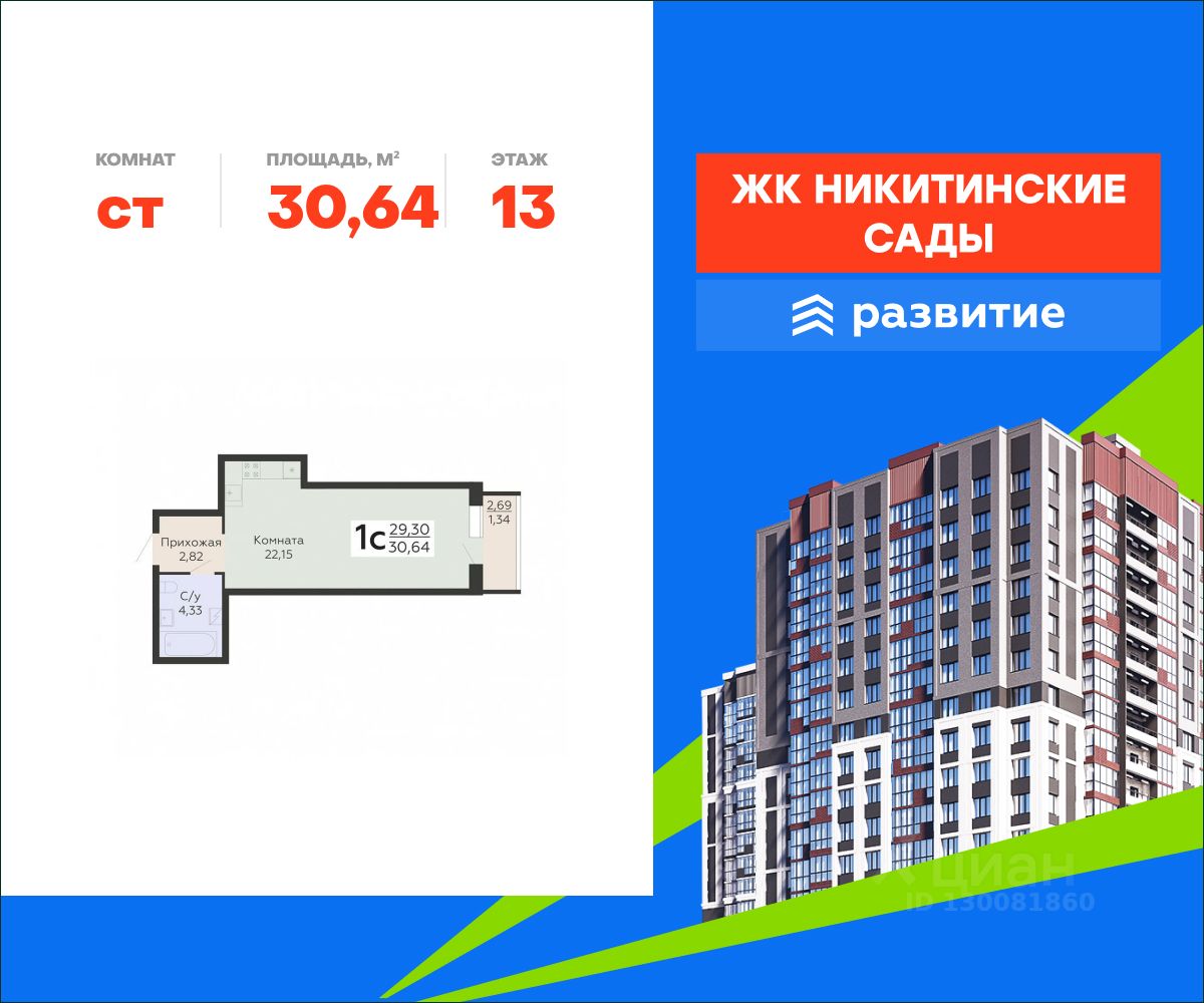В продаже квартира площадью 30.64 кв. м с отделкой. Квартира расположена на 13 этаже 20 этажного дома, в жилом комплексе комфорт-класса "Никитинские сады".