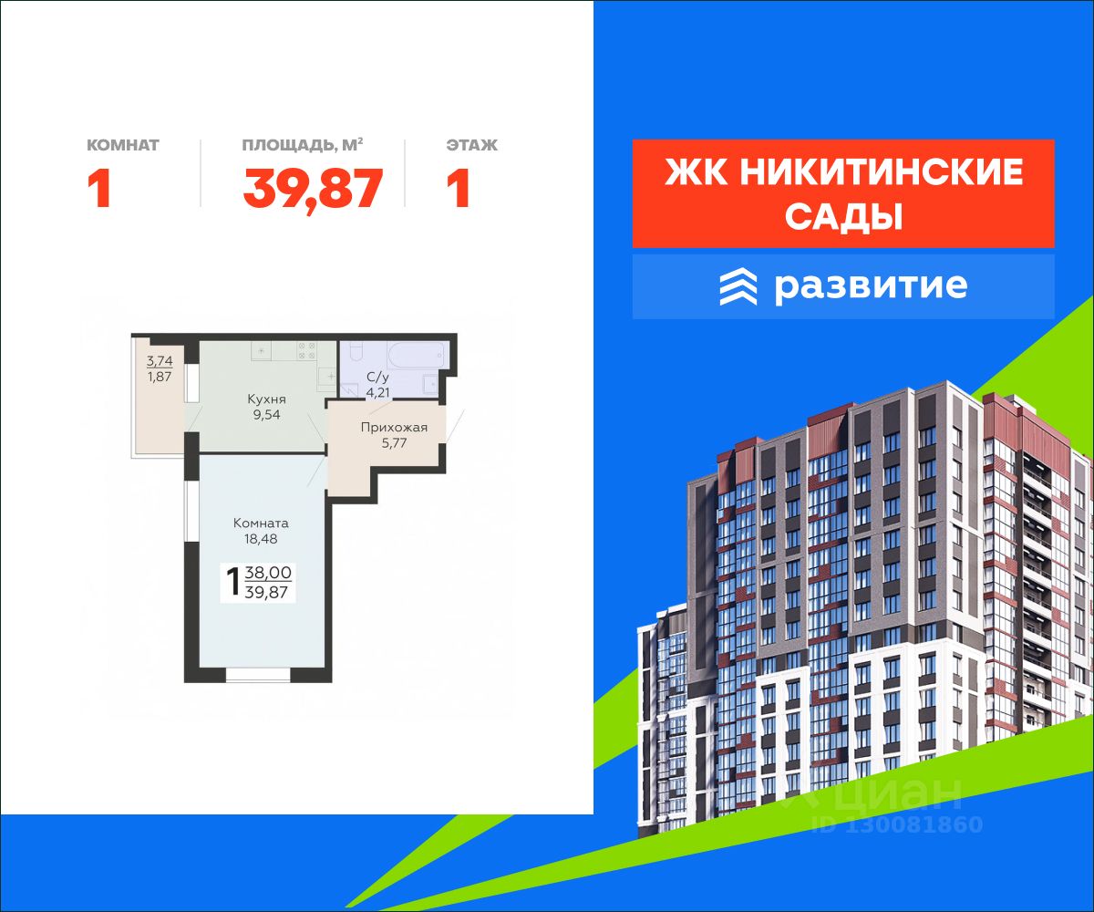 В продаже квартира площадью 39.87 кв. м без отделки. Квартира расположена на 1 этаже 20 этажного дома, в жилом комплексе комфорт-класса "Никитинские сады".