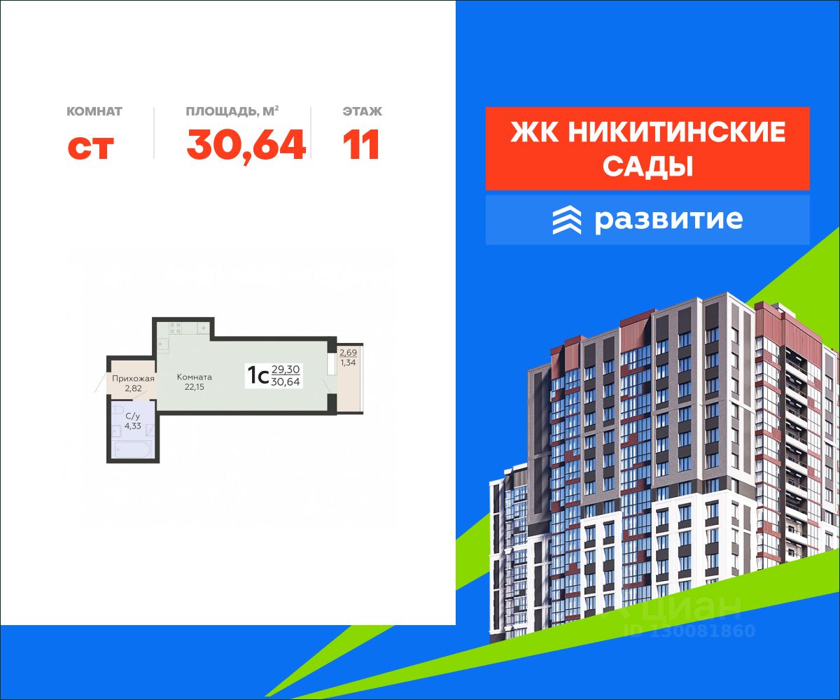 В продаже квартира площадью 30.64 кв. м с отделкой. Квартира расположена на 11 этаже 20 этажного дома, в жилом комплексе комфорт-класса "Никитинские сады".