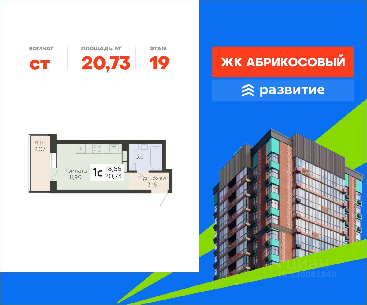 В продаже квартира площадью 20.73 кв. м с черновой отделкой. Квартира расположена на 19 этаже 19 этажного дома, в жилом комплексе комфорт-класса "Абрикосовый" (Застройщик - федеральный застройщик ГК "Развитие").