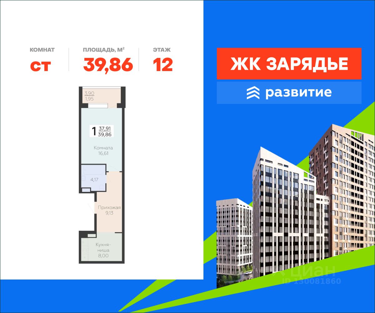 В продаже квартира площадью 39.86 кв. м с черновой отделкой. Квартира расположена на 12 этаже 21 этажного дома, в новом микрорайоне комфорт-класса "Зарядье" (Девелопер - федеральный застройщик ГК "Развитие").