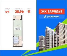 В продаже квартира площадью 28.96 кв. м с черновой отделкой. Квартира расположена на 11 этаже 18 этажного дома, в новом микрорайоне комфорт-класса "Зарядье" (Девелопер - федеральный застройщик ГК "Развитие").
