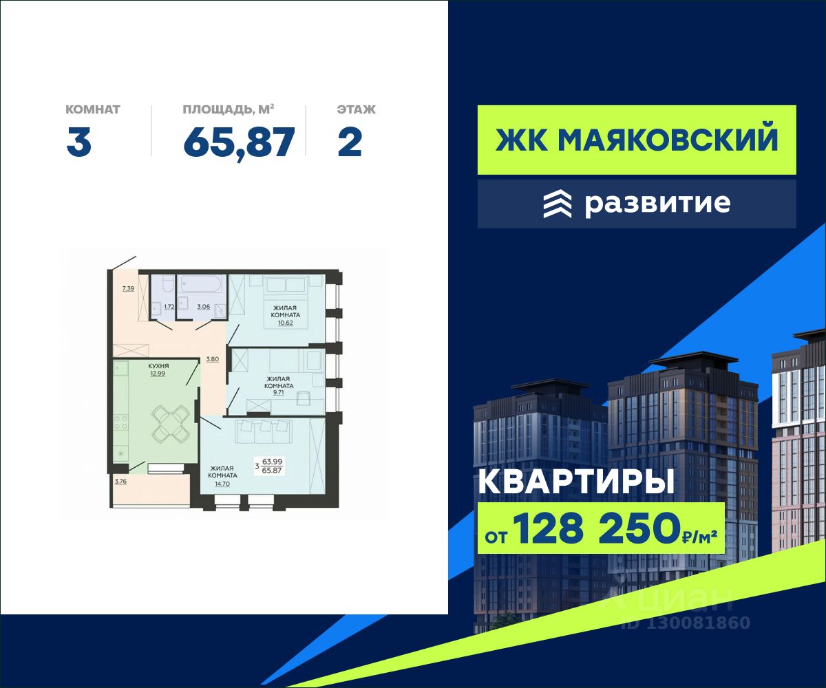 В продаже квартира площадью 65.87 кв. м с черновой отделкой. Квартира расположена на 2 этаже 21 этажного дома, в жилом комплексе "Маяковский" от федерального застройщика ГК "Развитие".
