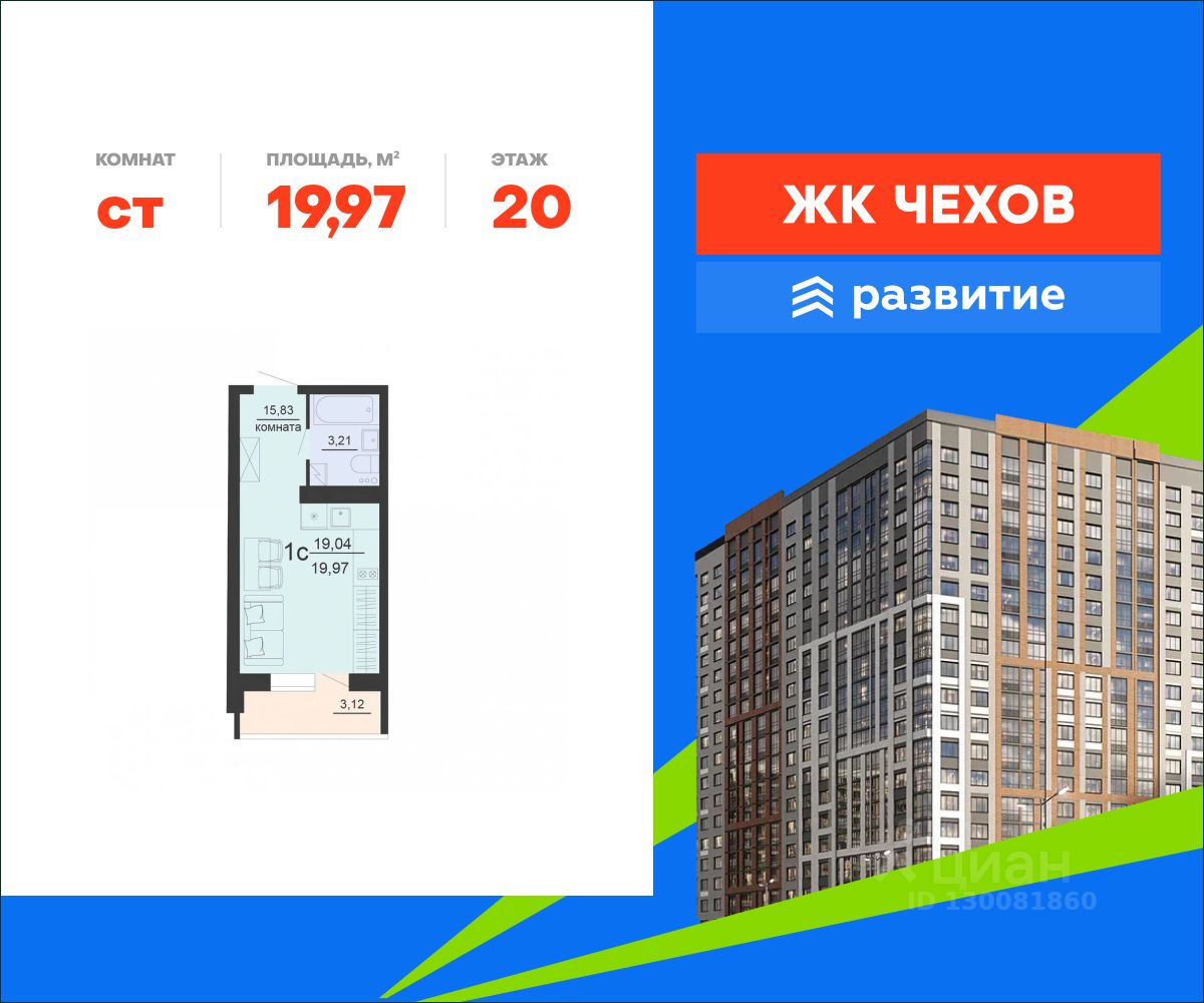 Продается квартира площадью 19.97 кв. м без отделки. Квартира находится на 20 этаже 20 этажного дома, в жилом комплексе "Чехов". Комплекс расположен по адресу - г. Воронеж, ул. Богдана Хмельницкого д. 45а.