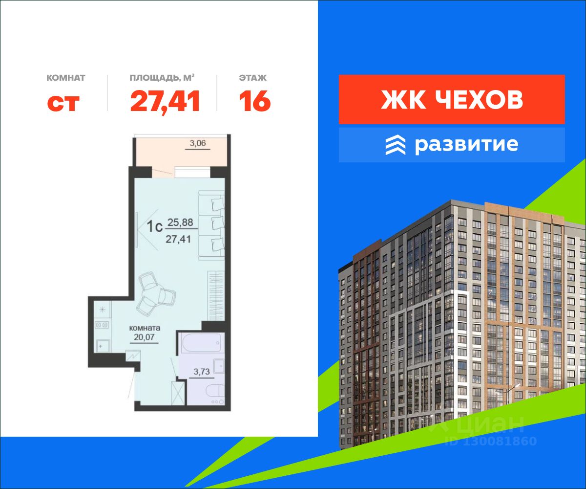 Продается квартира площадью 27.41 кв. м без отделки. Квартира находится на 16 этаже 20 этажного дома, в жилом комплексе "Чехов". Комплекс расположен по адресу - г. Воронеж, ул. Богдана Хмельницкого д. 45а.