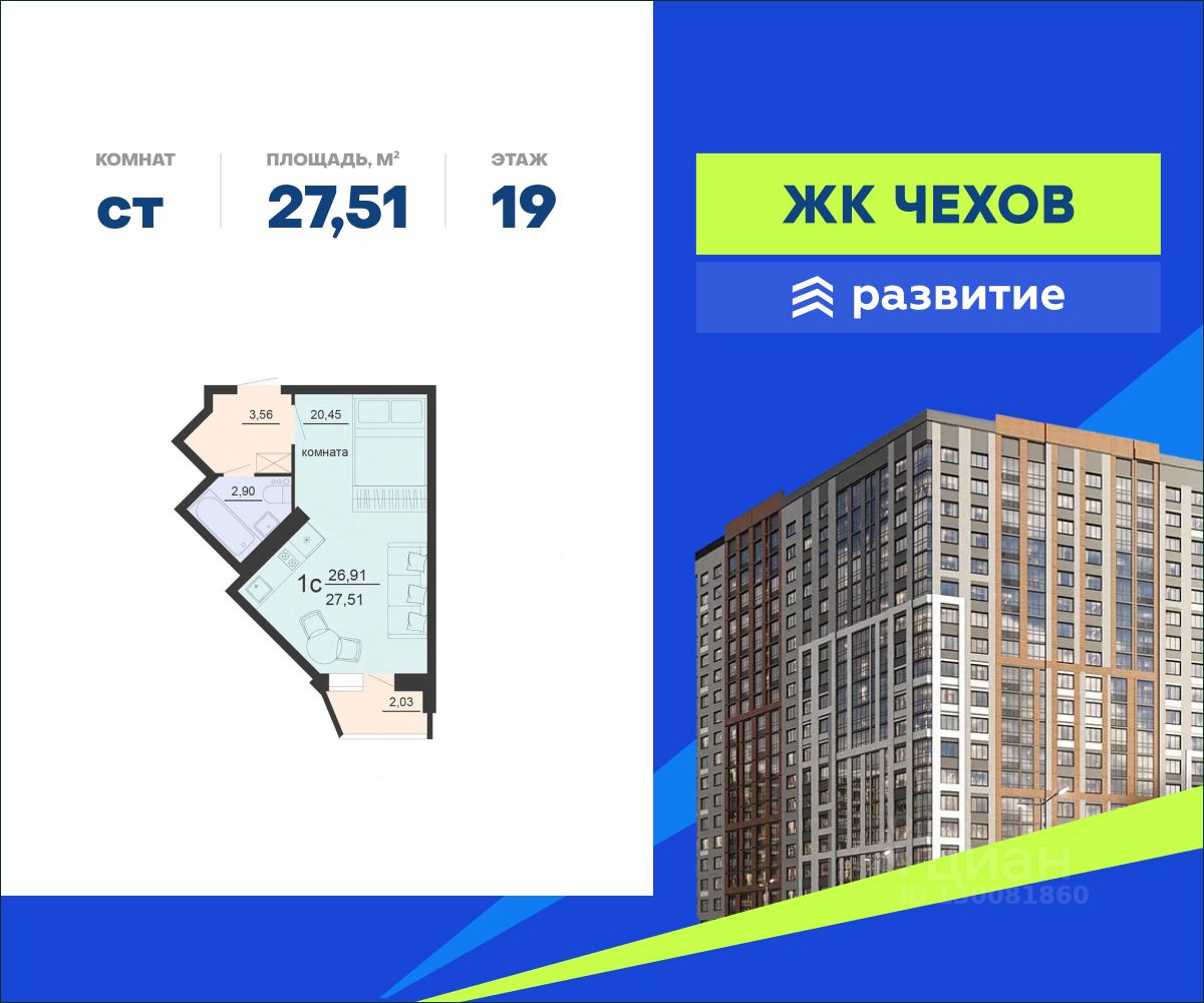 Продается квартира площадью 27.51 кв. м без отделки. Квартира находится на 19 этаже 20 этажного дома, в жилом комплексе "Чехов". Комплекс расположен по адресу - г. Воронеж, ул. Богдана Хмельницкого д. 45а.