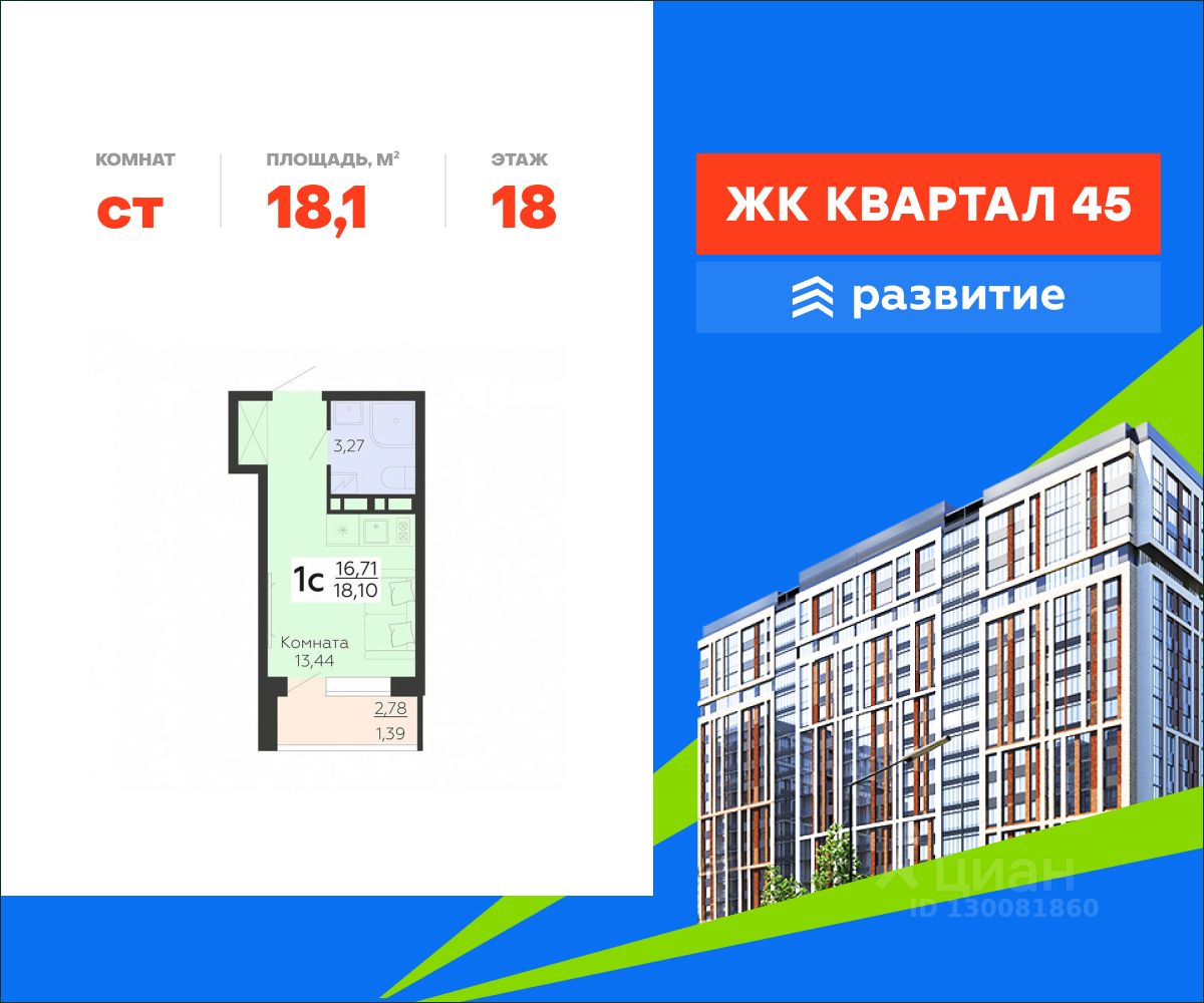 В продаже квартира площадью 18.10 кв. м с черновой отделкой. Квартира расположена на 18 этаже 18 этажного дома, в жилом комплексе комфорт-класса "Квартал 45".