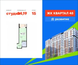 В продаже квартира площадью 24.19 кв. м с черновой отделкой отделкой. Квартира расположена на 15 этаже 18 этажного дома, в жилом комплексе комфорт-класса "Квартал 45".
