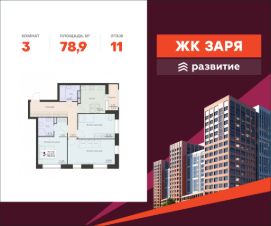 В продаже квартира площадью 78.90 кв. м с черновой отделкой. Квартира расположена на 11 этаже 14 этажного дома, в новом жилом комплексе "Заря" от федерального девелопера "Развитие".