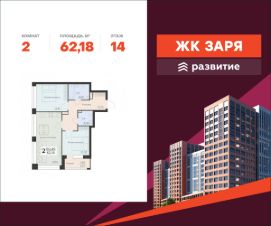 В продаже квартира площадью 62.18 кв. м с черновой отделкой. Квартира расположена на 14 этаже 16 этажного дома, в новом жилом комплексе "Заря" от федерального девелопера "Развитие".