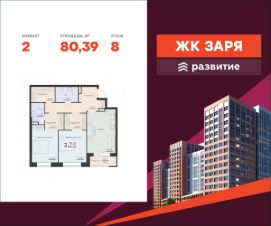 В продаже квартира площадью 80.39 кв. м с черновой отделкой. Квартира расположена на 8 этаже 14 этажного дома, в новом жилом комплексе "Заря" от федерального девелопера "Развитие".