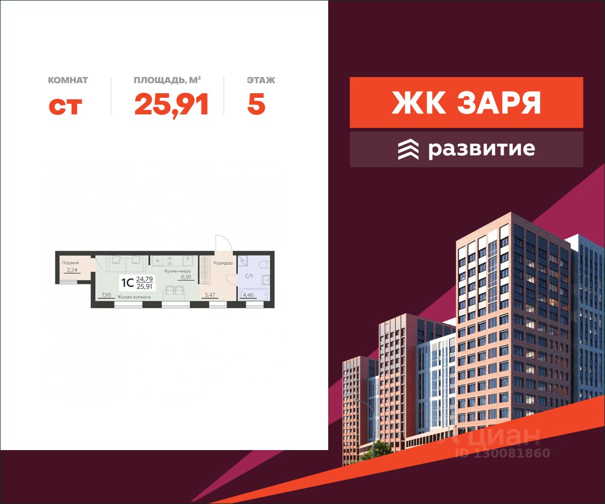 В продаже квартира площадью 25.91 кв. м с черновой отделкой. Квартира расположена на 5 этаже 14 этажного дома, в новом жилом комплексе "Заря" от федерального застройщика "Развитие".