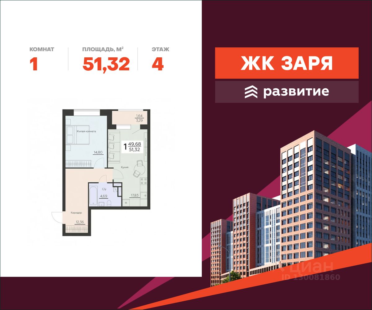 В продаже квартира площадью 51.32 кв. м с черновой отделкой. Квартира расположена на 4 этаже 8 этажного дома, в новом жилом комплексе "Заря" от федерального застройщика "Развитие".