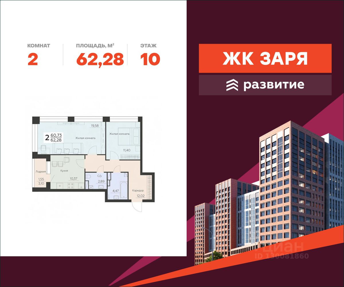 В продаже квартира площадью 62.28 кв. м с черновой отделкой. Квартира расположена на 10 этаже 16 этажного дома, в новом жилом комплексе "Заря" от федерального застройщика "Развитие".
