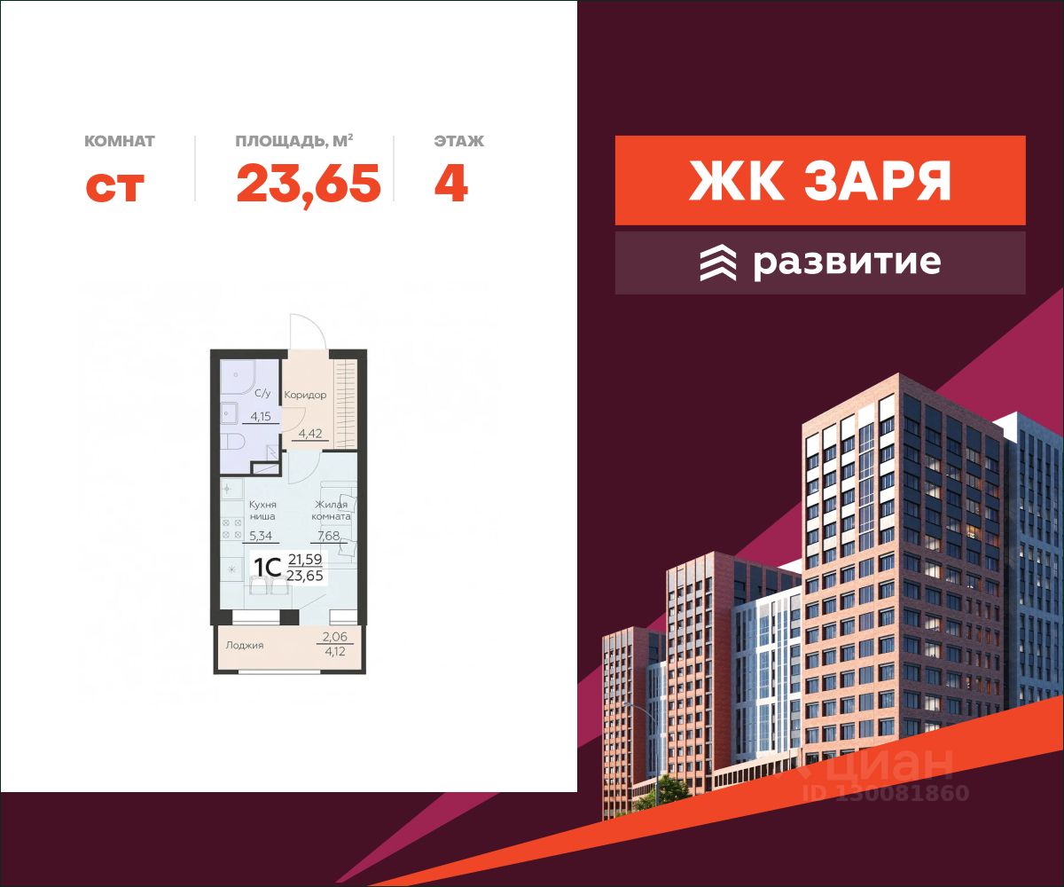 В продаже квартира площадью 23.65 кв. м с черновой отделкой. Квартира расположена на 4 этаже 14 этажного дома, в новом жилом комплексе "Заря" от федерального застройщика "Развитие".