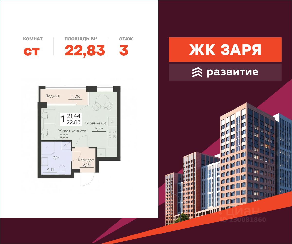 В продаже квартира площадью 22.83 кв. м с черновой отделкой. Квартира расположена на 3 этаже 14 этажного дома, в новом жилом комплексе "Заря" от федерального девелопера "Развитие".