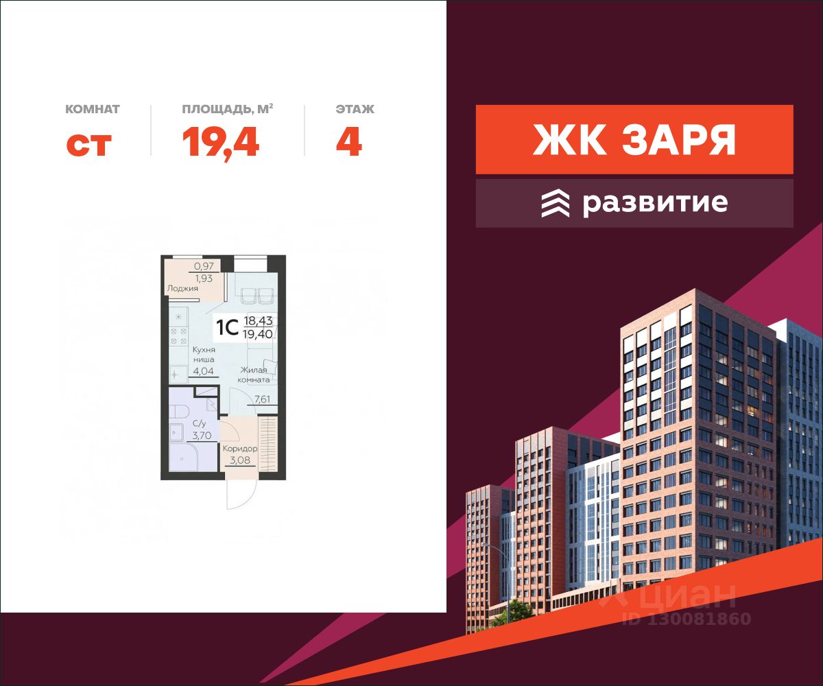 В продаже квартира площадью 19.40 кв. м с черновой отделкой. Квартира расположена на 4 этаже 14 этажного дома, в новом жилом комплексе "Заря" от федерального застройщика "Развитие".