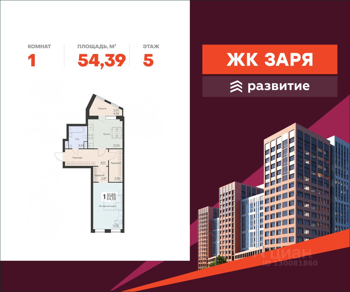 В продаже квартира площадью 54.39 кв. м с черновой отделкой. Квартира расположена на 5 этаже 16 этажного дома, в новом жилом комплексе "Заря" от федерального девелопера "Развитие".