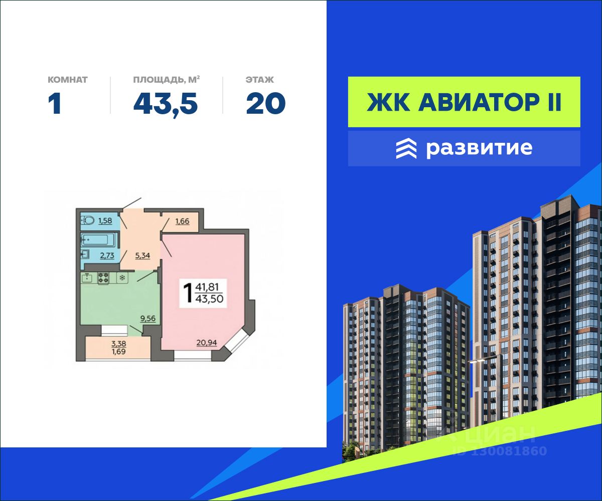 В продаже квартира площадью 43.50 кв. м с черновой отделкой. Квартира расположена на 20 этаже 20 этажного дома, в жилом комплексе комфорт-класса "Авиатор 2".