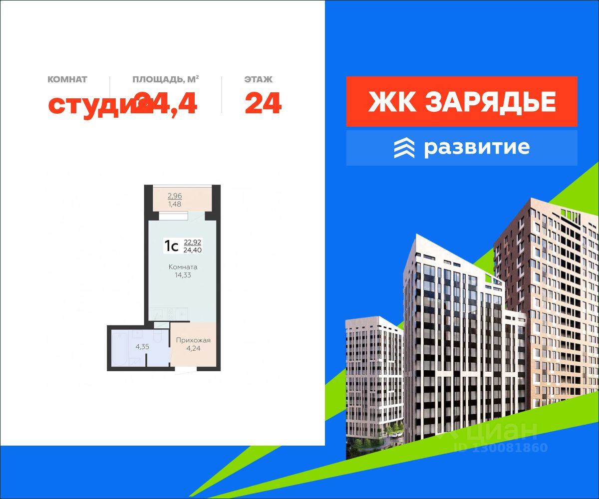 В продаже квартира площадью 24.40 кв. м с отделкой. Квартира расположена на 24 этаже 24 этажного дома, в новом микрорайоне комфорт-класса "Зарядье" (Девелопер - ГК "Развитие").