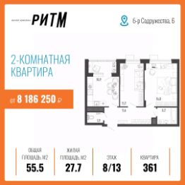 Общая площадь55,5 м²