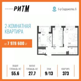 ЖК "РИТМ" — ДОСТУПНАЯ И ВЫГОДНАЯ ИНВЕСТИЦИЯ В ВАШЕ БУДУЩЕЕ Жилой комплекс "Ритм" по ул. Бульвар Содружества уч. 6 — часть масштабного проекта развития территории воронежского левобережья — микрорайона "Ключи", который займет 28,6 га недалеко от въезда в город по тамбовскому направлению. Здесь строится инновационный красивый мини-город. Он насыщен социальной и коммерческой инфраструктурой и обеспечен новейшими коммуникациями. Комплекс состоит не только из качественных домов. Решения по благоустройству стимулируют ведение активного здорового образа жизни. Продуманы возможности для взаимодействия людей, их творческой самореализации, выстраивания добрососедских связей и формирования современного приятного комьюнити. И все это на благоприятном экологическом фоне. Это действительно новый шаг в создании привлекательной среды для жизни в современном ритме! Жить, не ограничивая себя и свою семью, — разве не об этом вы мечтали? Вас ждет инновационное пространство, где вы будете вести свою насыщенную и интересную жизнь в выбранном вами ритме. Подземный паркинг на -1 этаже вместимостью на 114 машино-места, в том числе семейные парковки на два автомобиля освобождает двор от машин — там гораздо приятнее гулять с детьми или заниматься спортом. Жители смогут выходить к своему автомобилю в теплый паркинг прямо из лифта — нет беспокойства из-за погодных условий или за сохранность транспортного средства. Ваши гости тоже не останутся без парковки — на придомовой территории организовано - 131 место и вне придомовой территории - 213 мест. Для абсолютного комфорта на -1 этаже в каждой секции расположены кладовые помещение площадью от 2,10 до 5,0 кв.м., где можно хранить все что угодно — велосипеды, санки, лыжи и прочие вещи. Они больше не будут занимать весь балкон. Там гораздо приятнее пить кофе и любоваться видом из окна. ИНФРАСТРУКТУРА и ПРЕИМУЩЕСТВА Инновационное жилье в ЖК "Ритм" совсем рядом — 5 минут до Остужевского кольца, 20 минут до центра, рядом новая транспортная развязка. Легко добраться до работы и вузов, на концерт или в гости. Первый цифровой квартал в городе Дворы без машин Подземный паркинг и кладовые (в каждой секции) Сервисная Управляющая Компания (Smile) Новая инфраструктура района и коммуникаций Рядом с вами: новая уже действующая школа - 3 минут (просто перейти дорогу) новый детский сад (проект на стадии разработки, ориентировочный срок сдачи конец 2026 года) - 5 минут (просто перейти дорогу) 5 минут от центральной площади событий и прогулочных аллей стадион и спортивные площадки поликлиника (проект на стадии разработки) магазины аптеки детские площадки